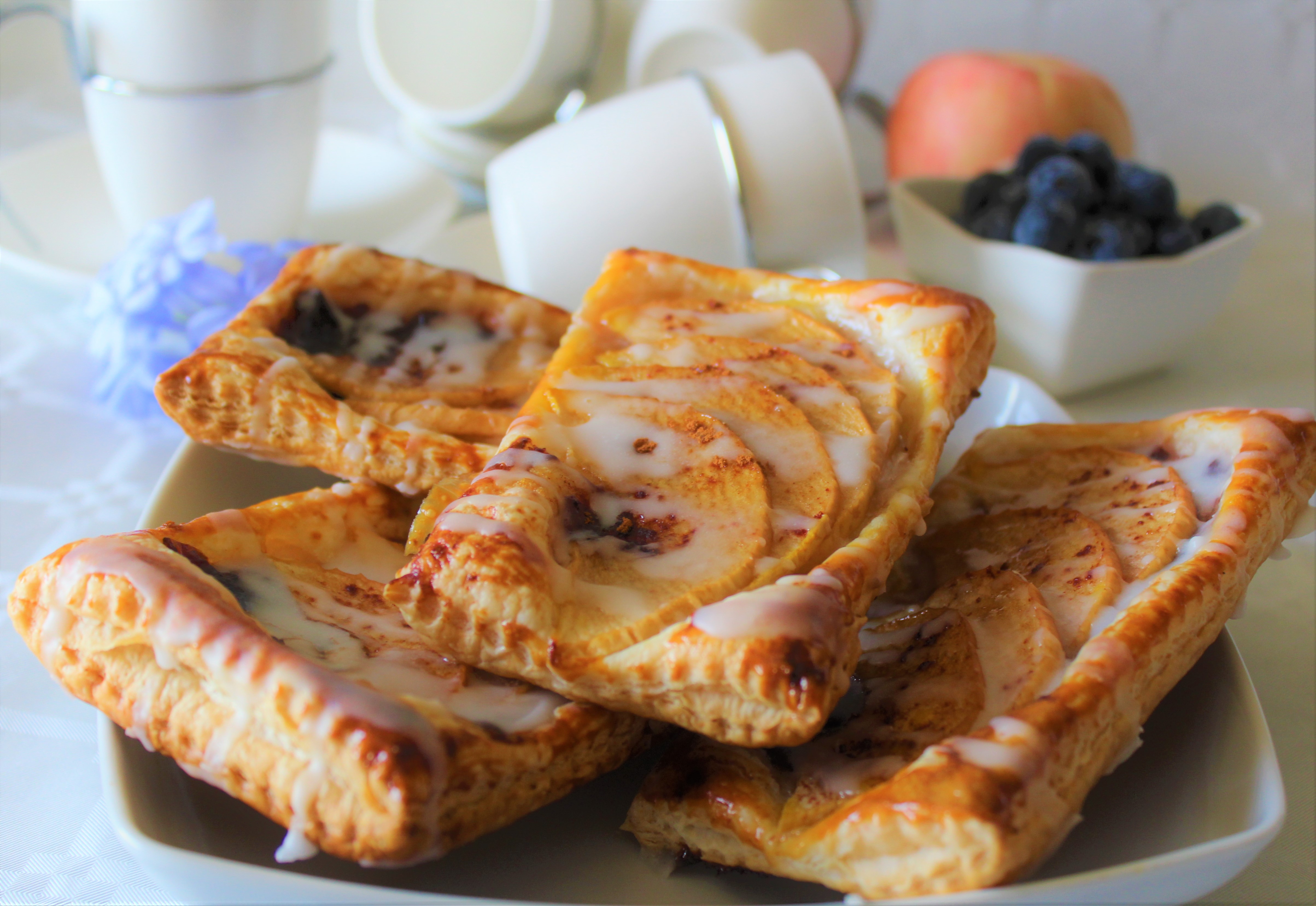 Spread a teaspoon or so of the jam in the middle of each oblong, leaving the edges around where you have scored, clear of jam. Then top with overlapping apple slices. Sprinkle each one with a pinch of cinnamon and brown sugar. Brush egg yolk around the edges and bake centre oven for around 20 minutes until puffed and golden.