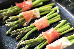 Holding each spear of asparagus individually, bend it until the woody end snaps off. Place 5 spears together and wrap the ham around them to hold them together. Drizzle or spray with Olive oil, a few twists of black pepper and a sprinkle of salt. Finally grate a little garlic over them. When you are ready, bake for around 15 mins at 200deg C. Serve whilst warm.