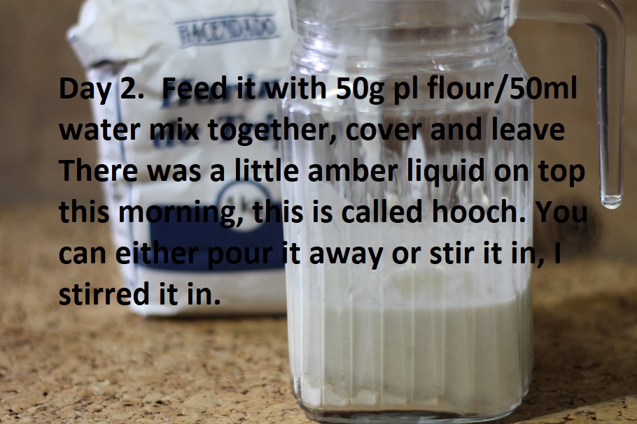 Day 2. Feed it with 50g pl flour/50ml water mix together, cover and leave