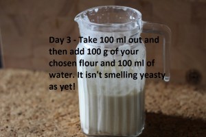 Day 3. Discard 100g and feed the rest with 100g pl flour/100ml water mix together and leave