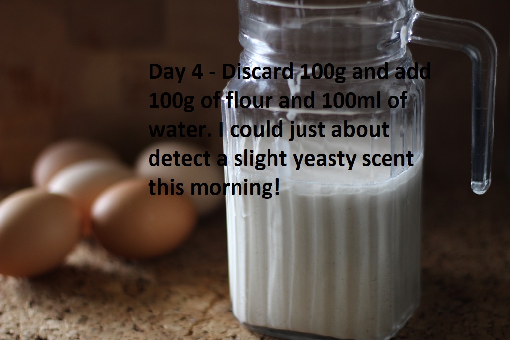Day 4. Discard 100g and feed the rest with 100g pl flour/100ml water mix together and leave